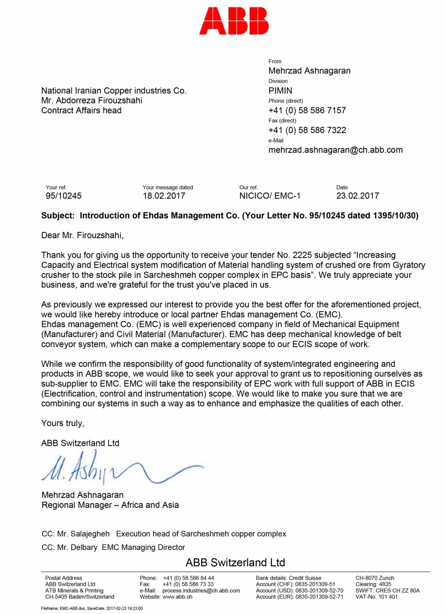شرکت مدیریت احداث برای حضور در مناقصه افزایش ظرفیت سیستم انتقال مواد سنگ شکسته  از سنگ شکن ژیراتوری به استوک پایل در مجتمع مس سرچشمه با شرکت ABB  تفاهم نامه همکاری امضا کرده است مدیریت احداث به عنوان نماینده ABB  در ایران مشغول به فعالیت می باشد.